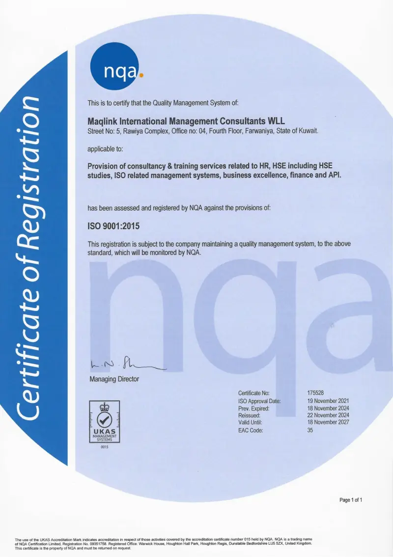 Maqlink Consultants is a very professional service provider. They aided establishment of a QHSE management system and securing of the ISO QHSE Certifications for our division in Iraq even while in hostile areas of conflict. Their stellar contribution is much appreciated.